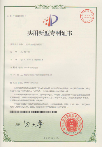 我公司獲得《大功率LED道路照明燈》實用新型專利證書