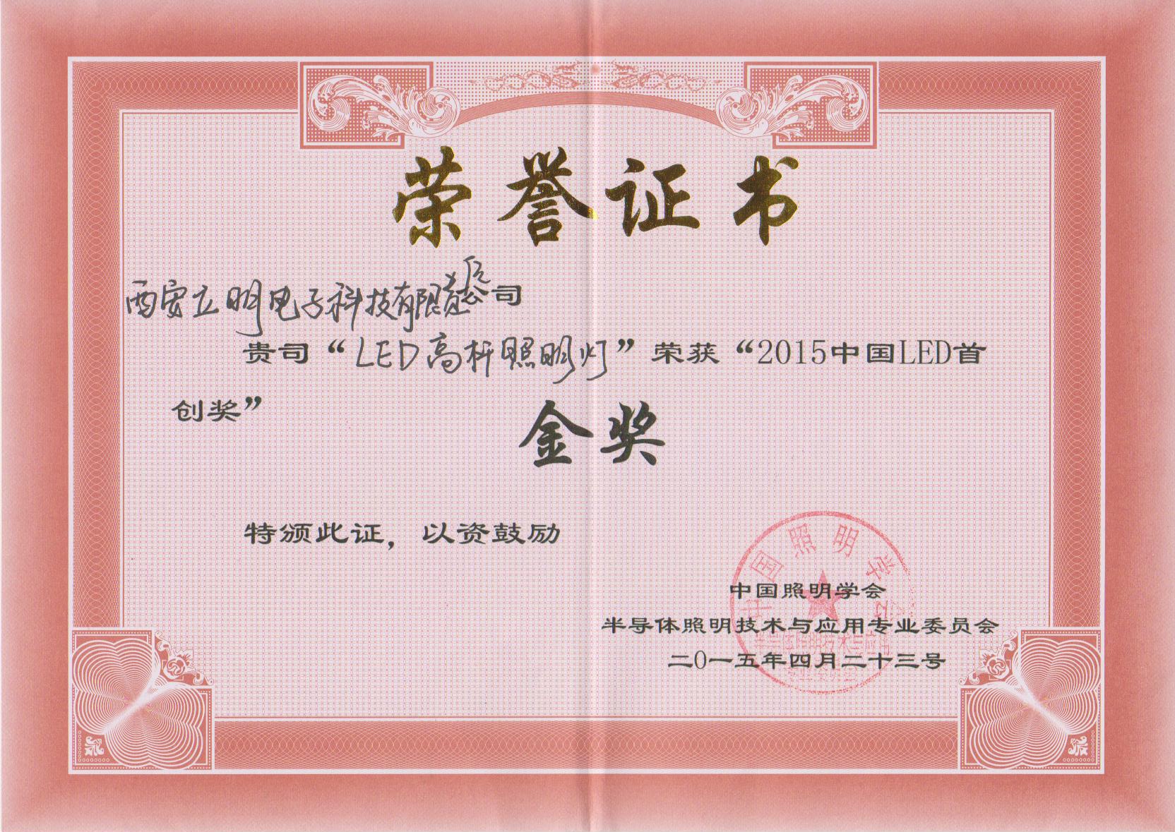 “中國LED首創獎”是為表彰在中國LED行業首度創新和自主創新方面做出突出貢獻的企業和個人而設立的年度獎項。西安立明電子科技有限責任公司榮獲2015 “中國LED首創獎”金獎。